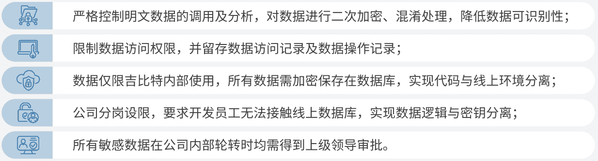 公司对用户个人信息实施脱敏处理,,严格限制用户信息用途,,,,数据使用完成后集中归档处理。。。为进一步确保数据处理过程的安全,,,公司根据实际的业务工作分岗设限,,最大程度保护数据隐私安全,,,如在生产网络中的加密数据由研发部门员工负责编写加、、解密程序,,但其无法直接访问到加密后的数据库;程序的加、、解密密钥由运维员工单独配置。。。