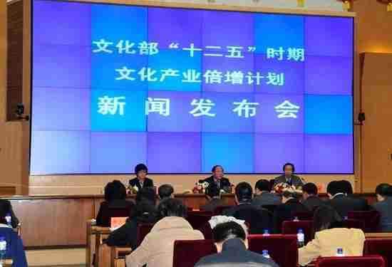 2月28日下午,,,文化部在京召开新闻发布会,,,正式向社会发布《文化部“十二五”时期文化产业倍增计划》,,提出了 “十二五”期间文化部门管理的文化产业增加值年平均现价增长速度高于20%,,,2015年比2010年至少翻一番,,,,实现倍增的奋斗目标。。。